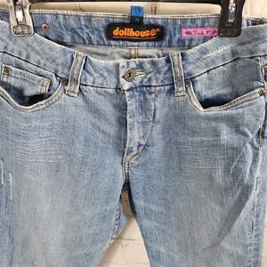 This product is a pair of vintage Y2K Dollhouse Junior's Jeans in size 11, featuring a solid blue color and distressed detailing. The jeans have a low rise and a regular fit, with a 5-pocket design and a flared style. Made of cotton denim in a light fabric wash, these machine washable jeans are perfect for women looking to add a festival or hippie vibe to their wardrobe with a touch of 90s flair. The brand is Dollhouse, and the waist size is 30 inches with an inseam of 32 inches.