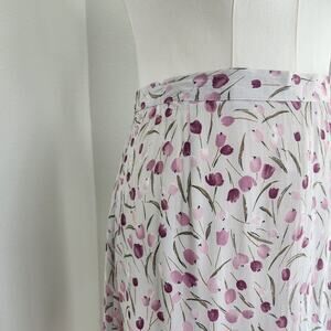 In excellent vintage condition, a late 90s to early 2000s Dress Barn Woman midi skirt with a pink and purple tulip floral print.