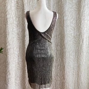 Description: gorgeous silver and black super stretchy boat neck cocktail bodycon mini dress by ESTAM in US women’s size M.
