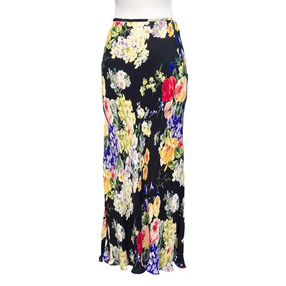 Bring some bold Y2K romance to your wardrobe with this gorgeous vintage Ellen Tracy silk floral maxi skirt. Features a vibrant garden-print on a deep black background — perfect for whimsygoth, romantic, cottagecore, fairy and elegant vintage styles.