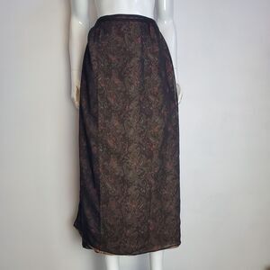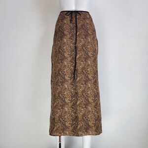 Vintage Y2K Emma James reversible wrap midi skirt with 2 ties at waistband. Brown paisley on 1 side, brown paisley with sheer black overlay with red floral design on other side. Tag is flippable depending on what side you're wearing.