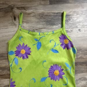Bright and nostalgic 90s/Y2K Exhilaration slip dress featuring a neon lime green base with vibrant purple daisy flowers and blue leaves. Classic spaghetti straps, stretchy bodycon fit, and soft fabric. Made in the USA — true vintage Target label! Perfect for 90s aesthetic, summer festivals, or layering.