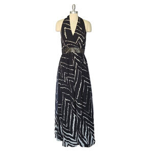 Vintage Y2K Express Black Halter Maxi Dress Size S Ikat Sequins Formal Party