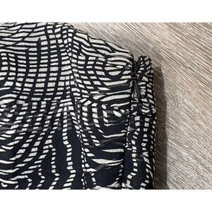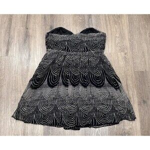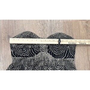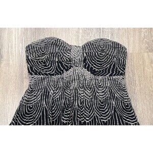 Express strapless top with a sweetheart neckline and babydoll silhouette. Black and white geometric print, silk shell with polyester lining. Great Y2K party or night-out style. Side zip closure.