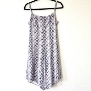 Excellent used condition! Sleeveless purple and black snake skin print dress. Pointed bottom hymn at front and back. Black beaded detail along a square neck line. No zip closure in a popover style. Plenty of stretch in a relaxed fit. Great for date night!