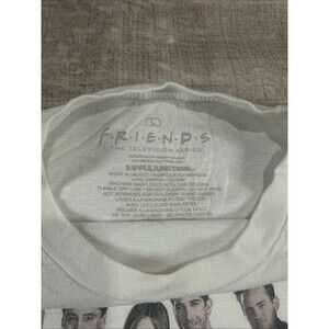 This Vintage Y2K FRIENDS T-Shirt in adult size L is a white short sleeve tee featuring a graphic print of the iconic TV show Friends. Made of cotton jersey fabric, this regular fit shirt is machine washable and suitable for all seasons. With a round neckline and adjustable features, this breathable t-shirt is a must-have for any fan of the 90s TV show Friends. Perfect for both men and women, this vintage piece from Hot Topic is a timeless addition to any wardrobe.