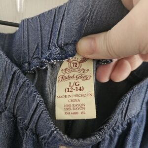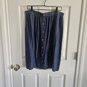In great condition with no flaws or wear- Vintage Y2K from the discontinued brand Faded Glory faux denim lightweight knee length skirt featuring a faux button front detail with tan/brown buttons and an elastic waist with an easy pull on feature.