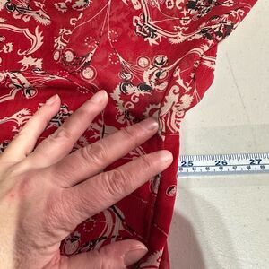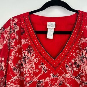 •Details- Beaded V-neck Red Floral Semi-sheer sleeves. Ties at waist. Wide sleeve. Lined