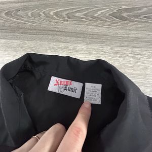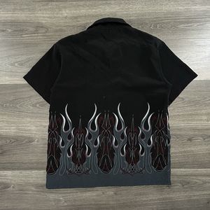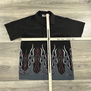 This Vintage Y2K Flames Button Up Shirt in Adult Small size features a striking graphic print of flames, giving off a skater, cyber, and chrome vibe. The short-sleeved shirt has a collared neckline with a button closure and is made of polyester knit fabric in black color. The retro shirt has a regular fit and is machine washable, with accents of buttons and contrasting trim. It exudes a mix of art, punk, biker, and geek themes, perfect for casual wear or a party/cocktail event.