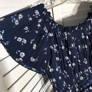 This vintage navy blue floral two-piece set features a cropped elastic-hem top and high-waisted shorts with side pockets. This matching outfit blends comfort with effortless charm.