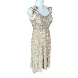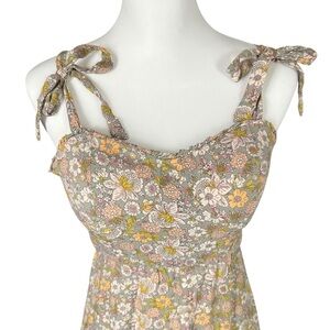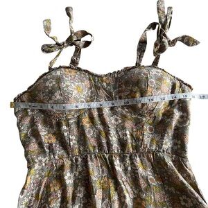 Super pretty floral sundress with tie shoulders and elastic bodice. Ruffled hem. All tags have been cut out and I’ve been unable to determine the brand or the material but it’s super soft and lovely and in excellent used condition. No real signs of wear, but ready to make a pretty impression all summer long.