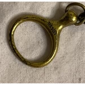 Add timeless charm to your look with this vintage-inspired Fossil toggle bracelet. Featuring a bold brass-tone chain with dangling lock, key, and Fossil logo charms, accented with rhinestones for just the right amount of sparkle. The secure toggle clasp makes it easy to wear. Perfect for Y2K fashion lovers, boho accessorizing, or everyday wear. A chic pre-loved piece ready for a new jewelry box.