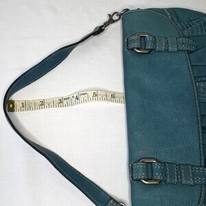 Add some Y2K charm to your collection with this vintage Fossil East West shoulder bag. Crafted in turquoise blue leather with denim-style stitching, it features buckle accents and Fossil’s iconic key charm. The surprise pink-purple lining gives it a fun, unexpected pop of color.