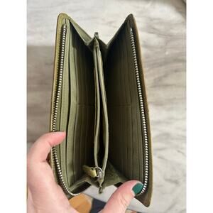 Excellent condition, the most minor or discoloration on one corner (see photo, it is not noticeable). Rich olive green, zip closure. Zip pocket on back and in interior. Multiple card slots.
