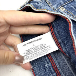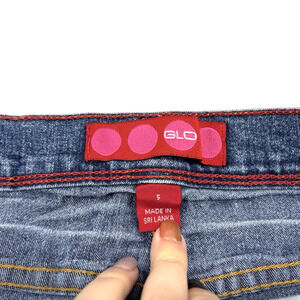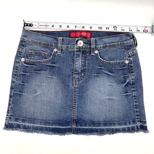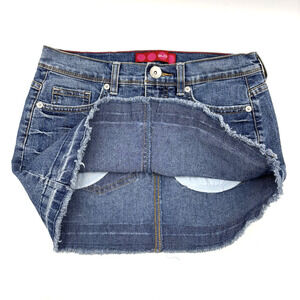 Vintage Y2K GLO Med Wash Rhinestone Raw Hem Stretch Denim Mini Skirt 5 28x12"