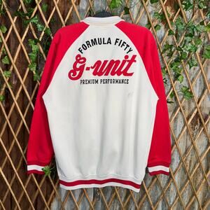 Vintage / Y2K G-Unit manufacturing, heavy wheat construction 50 embroidered patch, official size and weight raw materials formula 50 premium performance front and back double sided multiple graphic white/red color way zip up jumper track jacket style 50 Cent rapper hip-hop New York streetwear 2000s era skate grunge style