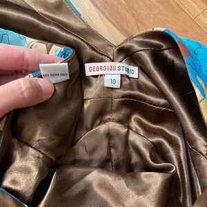 Description: vintage 00s brown and blue floral print silk chiffon handkerchief sleeveless dress by Georgiou Studio in US women’s size 10. ***Other clothing/accessories not included.