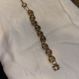 This stunning gold bracelet features intricate detailing and sparkling crystal accents, perfect for adding a touch of elegance to any outfit.