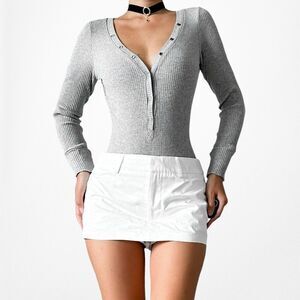 Vintage Y2K Gray Ribbed Knit Henley V-Neck Long Sleeve Bodysuit Top Size XS/S