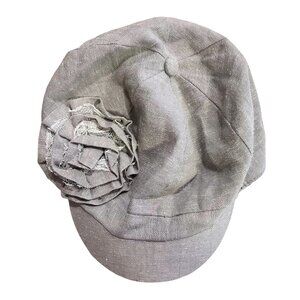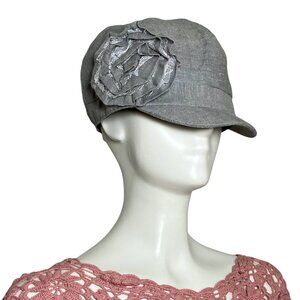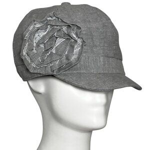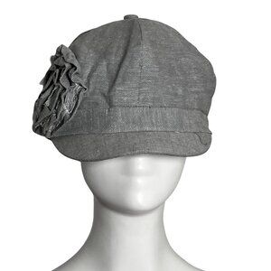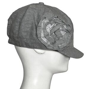 100% cotton grey newsboy cap style hat with a 3D flower by D&Y from their Elastafit line in the early 00s.