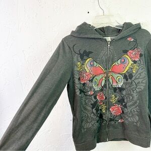 Vintage Y2K Grey Butterfly Rose Print Full Zip Up Hoodie Size Large