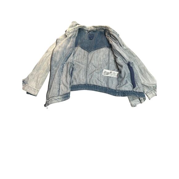 Vintage Guess Blue Denim Motorcycle Jacket in Women’s size Large. Features a bold asymmetrical zipper, moto-style lapels, and classic 90s/early 2000s Guess branding. The perfect soft grunge layering piece, this jacket blends edgy street style with a touch of fairycore-meets-Y2K energy.
