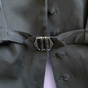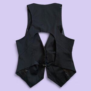 Vintage Y2K Guess Jeans black vest with sleek + sparkly details. Features beaded trim along the faux pockets and neckline, matte black buttons down the front, and a satin leopard print lining for a bold touch. Adjustable back buckle allows a customized fit. Crafted from a soft rayon-cotton blend with slight stretch.