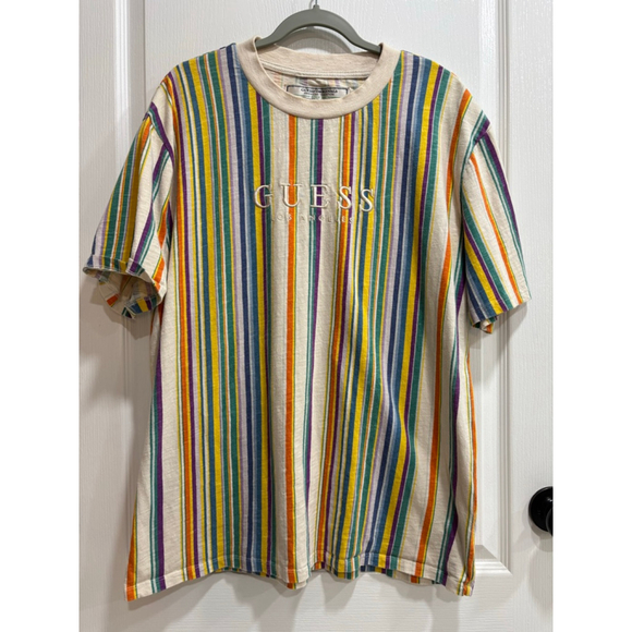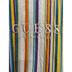 Pre-loved men's Guess Originals Riviera short-sleeve t-shirt in size Large, featuring a multi-color vertical stripe pattern on a beige background. The front displays "GUESS LOS ANGELES" embroidered. The shirt has a ribbed crew neck. The interior tag indicates "GUESS® ORIGINALS AMERICAN TRADITION SINCE 1981 DESIGNED IN CALIFORNIA MADE IN CHINA L". This is a great back to the Y2K era! Vintage, Classic, Casual