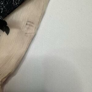 Vintage Y2K Guess Sheer Chiffon Peplum Top with Lace Appliqué. Pale taupe 100% polyester with black printed floral lace design. Applied floral lace appliqué. Button front. Peplum waist. Intentional frayed hems. Small discoloration near side seam, see photo. Womens size Small. Good used condition.