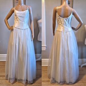 Vintage 2000s (Y2K) Jessica McClintock for Gunne Sax Millennium 2000s prom gown. White fabric with rhinestone detailing on bust and glitter tulle skirt. Corset bodice with boning. Zip up back. Full skirt with netting underneath. Dress is in good vintage condition with gentle wear and no flaws. Because this is a white vintage gown there may be some discoloration inside or outside. I haven't seen any of this wear personally, but please be aware of possible wear due to this garment's age.
