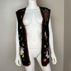 Halloween cardigan sweater vest dated 2002 that has cute applique and embroidery of ghosts, spiderwebs, and more. It has a v neck and buttons up the front with cute little smiley face buttons.