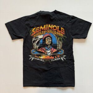 Vintage 2005 Harley Davidson Seminole Sanford Florida T-Shirt in black, size small. Authentic Harley Davidson Motorcycle dealership tee featuring bold Seminole Sanford Florida graphics and classic biker style. Soft cotton fabric with vintage wear, perfect for collectors, riders, or fans of Harley Davidson apparel. A great addition to any Harley Davidson vintage t-shirt collection or retro motorcycle clothing wardrobe.