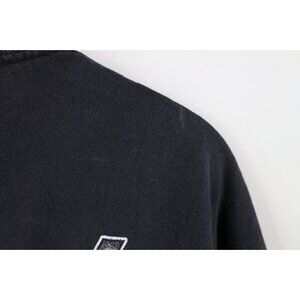 Bleach blemishes front. Blemishes, dark spots/lines throughout. Discolored. Graphics, color faded. Collar, arms discolored. Pilling