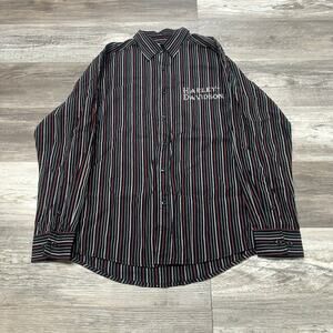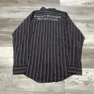 Vintage Y2k Harley Davidson Motorcycles An American Legend Pinstripe Black Red Gray Mens Small Embroidered Spell Out Button Up Shirt