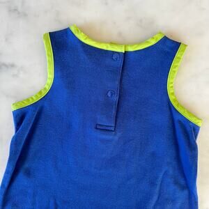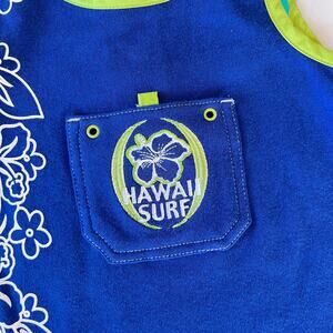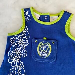 Vintage Y2K Hawaii surf hibiscus flower sleeveless romper. Marked a size 12 months. Blue with green trim and white floral print down side. Has a centered chest pocket with an embroidered hibiscus flower and "HAWAII SURF". Snap button closure at crotch and back neckline. New with tags.