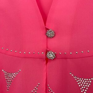Electric glam ✨ Vintage Y2K cardigan in hot pink with silver rhinestone embellishments + shiny accent buttons. 80s/2000s hybrid glam style. Size Medium, used good condition.