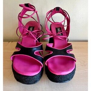 Vintage Y2K Hot Topic Black and Pink Strappy Wedge Sandals SZ 10 with Ankle Lace Up’s