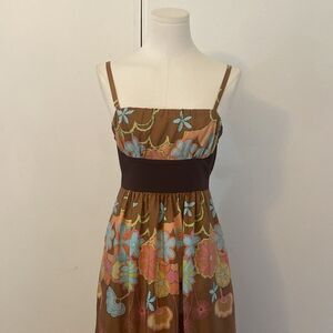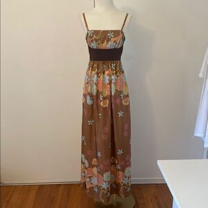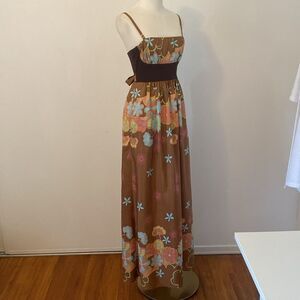 Vintage Y2K Hype Brown & Turquoise Floral Silk Maxi Dress Size 8