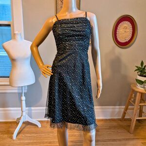 Vintage 2000s (Y2K) I.N. San Francisco polka dot sequin dress. Black mesh with color shifting sequins and ruching throughout. Lined. Dress is in good condition with missing elastic at waist.