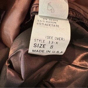 This vintage Y2K brown maxi skirt features a classic A-line silhouette with elegant pleats, perfect for a cocktail or night out. It has a metallic iridescent shimmer. Union made in USA.