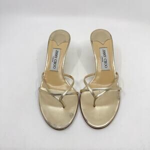 Details: Authentic vintage Jimmy Choo heels in metallic champagne gold nappa leather. Features thin crossover straps, slightly pointed toe, and slim stiletto kitten heel. Made in Italy. Classic early 2000s designer style. Minimalist, chic, and elegant. Includes original box and dust bag. Originally purchased from Bergdorf Goodman for $435.