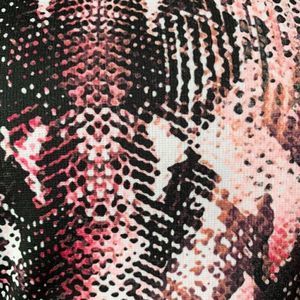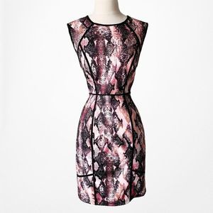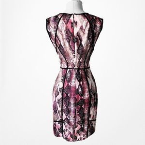 Pink black animal snake print crew neck knee length knit casual fitted bodycon dress. Sleeveless. Zips up in the back. Label is Jennifer Lopez. Tagged as a Size 6.