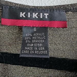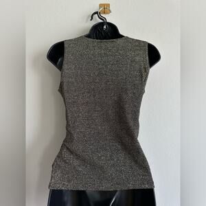 Sparkly without the itch. Vintage KIKIT metallic knit tank in a gunmetal/pewter sheen. Faux-wrap surplice neckline with soft ruching that drapes and flatters. Stretch knit (67% acrylic, 28% metallic, 5% spandex). Made in USA. Perfect for holiday parties, date night, or layered under a blazer.