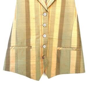 Chic vintage Karen Kane silk waistcoat in rich earth-tone stripes—perfect for quiet luxury, eclectic grandpa, and preppy layering trends. The raw-silk texture adds a natural, elevated feel, while the tailored silhouette works beautifully over blouses, tees, or on its own for a modern waistcoat look. A great neutral piece for workwear, academia style, or upscale casual outfits. Versatile, minimalist, and made in the USA with stunning craftsmanship.
