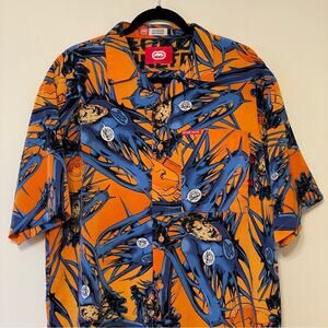 Details: Mr. Fantastic Vintage Y2K Ecko Unlimited rhino casual Large short sleeve shirt button down collared neckline chest pocket cartoon Fantastic Four
