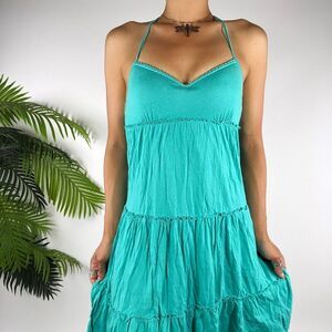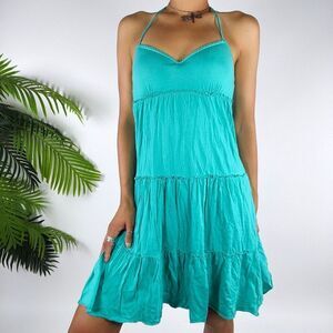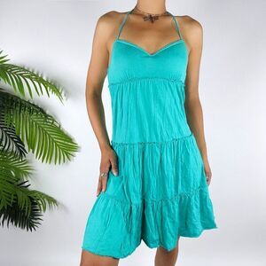 Vintage Y2K L.E.I Blue Boho Fairycore Beachy Casual Babydoll Halter Mini Dress S