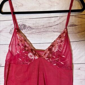 Elegant red sheer camisole with floral embroidery. Perfect for layering or wearing alone.
