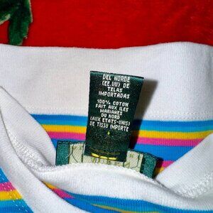 Color: White with turquoise, pink, yellow, and green stripes