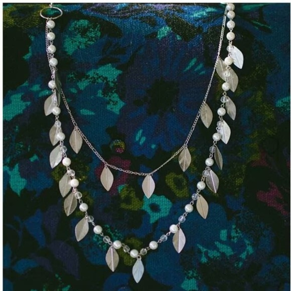 Vintage Y2K two-layer necklace featuring a delicate chain paired with small faux pearls and dangling metallic leaf charms. Soft, feminine, and very mid-2000s in that layered, romantic way. Original owner from the Y2K era. Great condition and kept lovingly in a jewelry box. A pretty piece for coquette, indie sleaze, or soft glam styling.