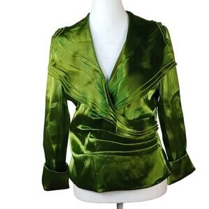 Step back in time with this vintage Y2K shimmery green blouse! This early 2000s formal glam top is perfect for your next Christmas party. The luxurious metallic finish catches the light, ensuring you'll be the center of attention. This stunning formal blouse is also great as an evening top. The faux wrap crossover top creates a flattering silhouette, complemented by a chic V neck. The long sleeves feature french cuffs, adding a touch of sophisticated detail. Embrace the festive spirit with this timeless piece, ideal for cocktail parties and holiday events. It's a classic and classy choice that exudes elegance and glamorous retro vibes. The jewel tone makes it a standout piece for any dressy occasion.